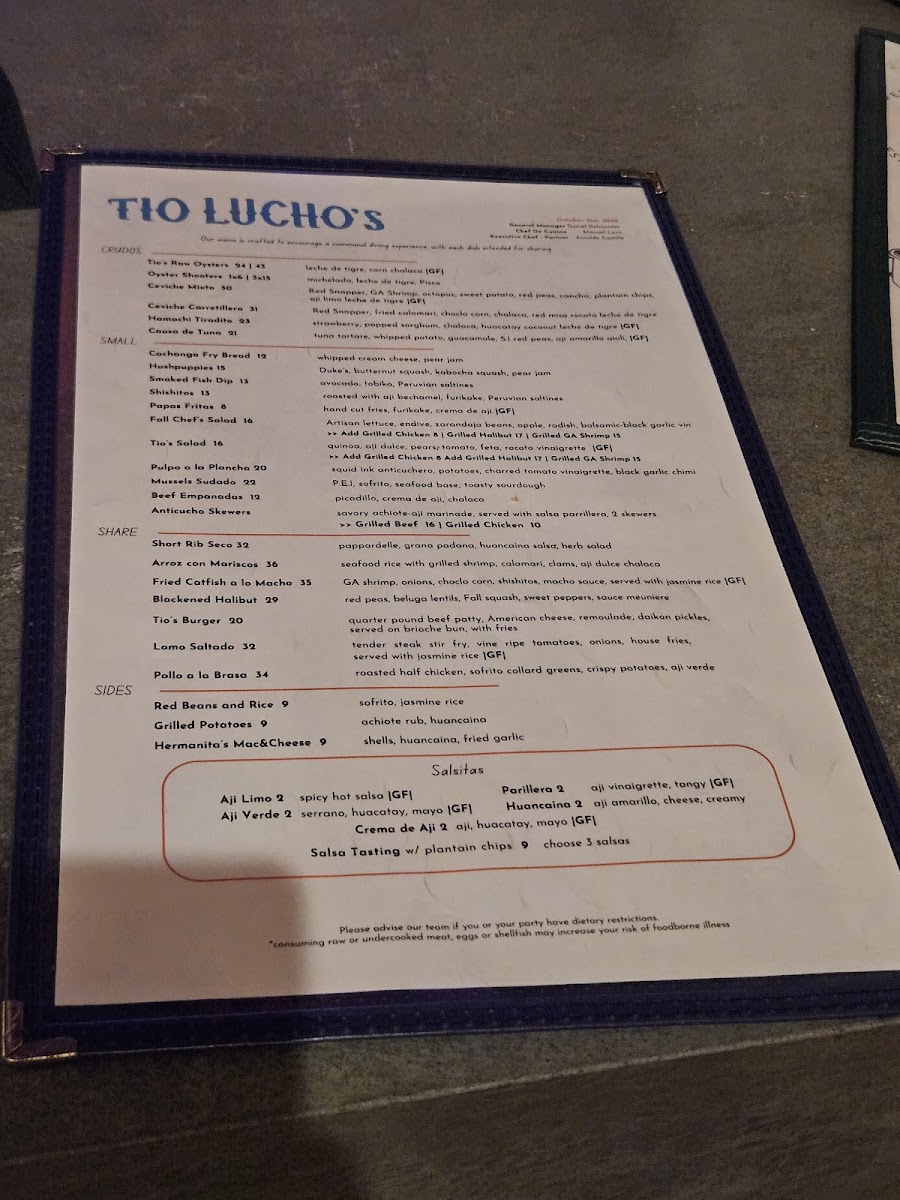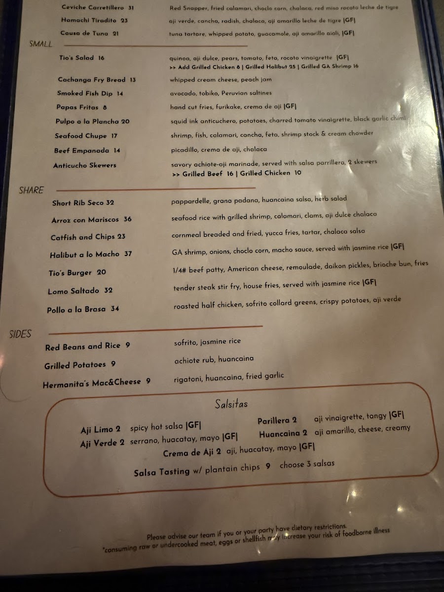 snapper, GA shrimp, octopus, sweet potato, cancha corn, onions, plantain chips, rocoto leche de tigre |GF|