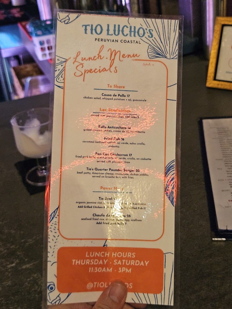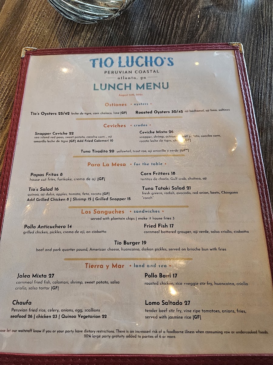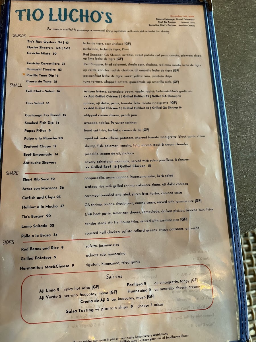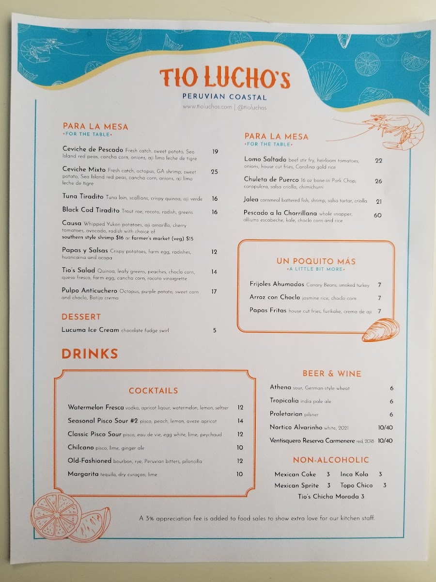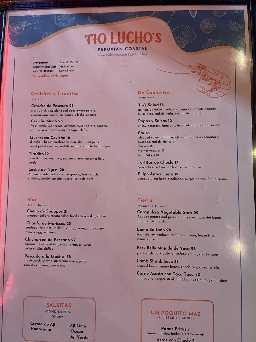red snapper ceviche, cornmeal fried calamari, choclo corn, cancha, chalaca, miso rocoto leche de tigre.